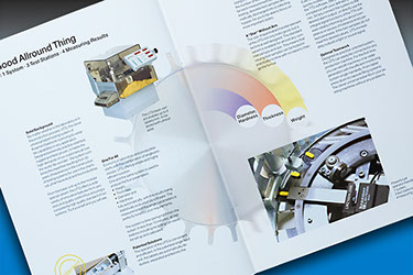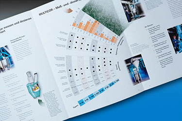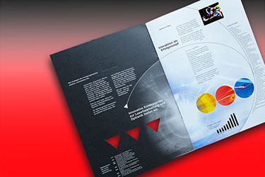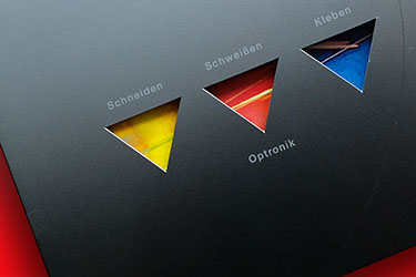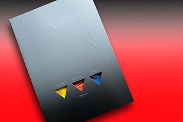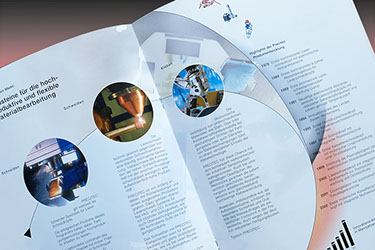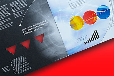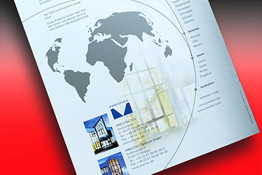 Precitec Imageprospekt CMYK + Weiss mit Stanzung und Prägung auf Chromolux-Silber