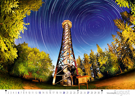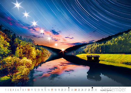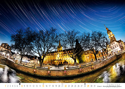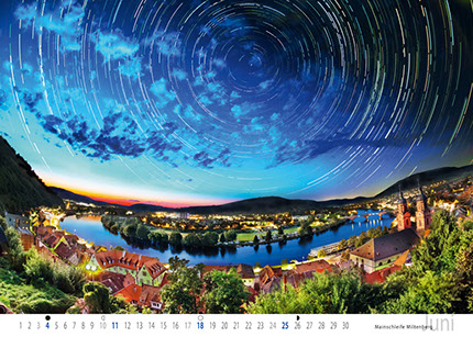 Mainschleife Miltenberg Von der Burgmauer fotografiert. Das Foto lässt die tolle Altstadt des Ortes erahnen. Durch den anvisier- ten zentralen Nord- oder Polarstern ziehen die Kreise der Sternstrichspuren mit der kreisförmigen Main- schleife um die Wette. Bei dieser Fotolocation lief alles wie geplant und sogar die Wolken trugen zur interessanten Aufnahme bei. Durch angenehme Gespräche mit Touristen erhielt ich meine erste Kalenderbestellung aus Ostdeutschland. Es sollte nicht die einzige überregionale bleiben.
