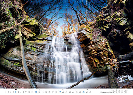 Margaretenschlucht Der größte Wasserfall des Odenwalds. Hier waren mehrere Versuche erforderlich, da gerne Nebel vom Neckar nachts die Sicht auf den Himmel verdeckt. Die Aufnahme entstand im Frühjahr nach vorange- gangenen Regenfällen, kurz vor Sonnenuntergang bis spät nachts. Fotoapparat samt Stativ standen im Wasser und trotz eines gebastelten Spritzschutzes war es erforderlich, das Objektiv zu trocknen. Durch ein Sandkörnchen polierte ich mir im Dun- keln einen dicken Kratzer in die Optik.