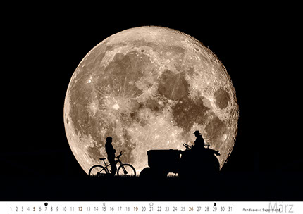 Rendezvous Supermond Ein nächtliches Zusammentreffen von Tradition und Moderne. Mit Oldtimertraktor, MTB und Foto auf der Jagd nach dem Supermond. Die Horizontlinie für Foto und Objekte passt. Der Abstand von Foto zum Horizont ist gut, die Berechnung des Mondaufgangs exakt. An- gespanntes Warten. Dann ziehen Wolken auf und der Mond ist nicht mehr zu sehen, der Traktoranlasser streikt . . . Beim nächsten Supermond 8 Wochen später in der Nacht der Perseiden klappt das Foto des ver- größerten Erdtrabanten und wird als anschauliches Trostpflaster mit dem Set des ersten Versuchs vereint.