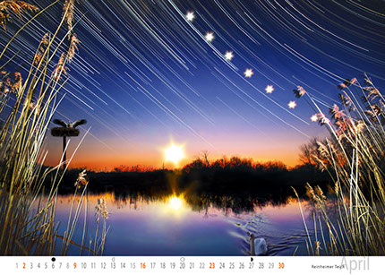 Reinheimer Teich Dieses Bild entstand beim 3. Anlauf. Es zeigt den Sonnenuntergang, die nächtlichen Sternstrich- spuren und die Phasen des Monduntergangs nach Mitternacht. Das Naturschutzgebiet Reinheimer Teich bildet durch die schilfumrahmten Wasser- flächen mit Feuchtwiesen einen perfekten Lebens- raum für zahlreiche Vogelarten und andere Exoten wie die Europäische Sumpfschildkröte. Es sind viele Weißstörche anzutreffen. Das Nest wurde sichtbar umquartiert. Der auf mich zuschwimmende Schwan erhoffte sich Futter.