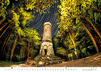 Turm Katzenbuckel Mit 626 m ist der Katzenbuckel die höchste Erhe- bung des Odenwalds. Vom 18 m hohen Turm ge- nießt man daher eine weite Sicht. Das noch nicht zu dichte, frische Grün des Frühjahrs gewährt noch einen Ausblick in den Sternenhimmel. Nach der Beleuchtung der Vegetation versagte meine Lampe und der Turm durfte im Licht- und Schattenspiel der tiefstehenden Sonne in Erscheinung treten. Ich hoffe es gelang mir, die einsame, windumtoste nächtliche Magie dieses Ortes einzufangen.
