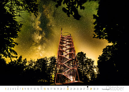 Trommturm Der erst am 3. September 2022 offiziell eröffnete Trommturm ist der modernste Turm des Odenwalds. Mit einer Höhe von 34 m und einer innovativ, exo- tischen Stahlkonstruktion thront er geneigt zum Tal und besticht mit einer bemerkenswerten Aussicht. Flankiert von der Milchstraße lädt die „Himmelsleiter“ zum Besteigen ein. Die Reduktion der Bildelemente steigert die Wirkung der Turmerscheinung. Die gelblich helle Horizontfärbung rührt von der Lichtverschmutzung der Bergstraße.