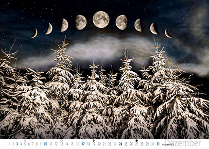 Winterwald Die Bäume, bei der Neunkircher Höhe aufgenom- men, verdanken den Neuschnee einer Art Apri- scherz am 02.04.22. Ich konnte mir dieses Ereignis nicht entgehen lassen und bewegte mich frisch nach einer OP auf zwei Krücken mit Materialruck- sack zum Standort. Alle Bilder der fotografierten Mondphasen entstanden in gesamt 35 Nächten, die gezeigte Auswahl wurde einmontiert. Ich hoffe Sie hatten ein gutes Jahr, Freude mit dem Kalender und wünsche Frohe Weihnachten 2023!