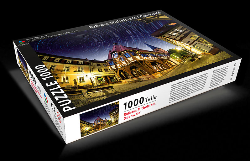 Michelstadt Durch die lange währende sommerliche Tageshelligkeit wartet man vergebens auf die Aktivierung der im Boden eingelassenen Beleuchtung des Rathauses. Die Straßenlaternen müssen den Job erledigen. Allerdings erzeugt die Langzeitbelichtung durch die direkte Einstrahlung Reflexionen auf dem Nachthimmel. Schwarzes Klebeband vorm Objektiv schafft Abhilfe. Trotz Lichtsmog der Stadt entsteht ein respektabeles Abbild des Sternen- himmels mit geschichtsträchtigem Vordergrundmotiv.