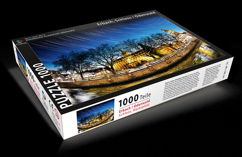 Erbach Mümling, Marktplatz, Schloss Danke für die freundliche Kooperation der Gemeinde. Die Schlossbeleuchtung übernahm der Haustechniker. Für die grell blendenden drei Stablampen bastelte ich Hauben zur Abschattung und stülpte diese mit einer Teleskopstange über die Spitzen. Die blendende Mühlenradbeleuchtung wurde ebenfalls abgeschattet, und die Birnen der Brücken- pfeilerlaternen herausgeschraubt. Die Lichterketten der Bäume konnten leider nicht aktiviert werden. Doch so hatte der Erbacher Sternenhimmel eine Chance.